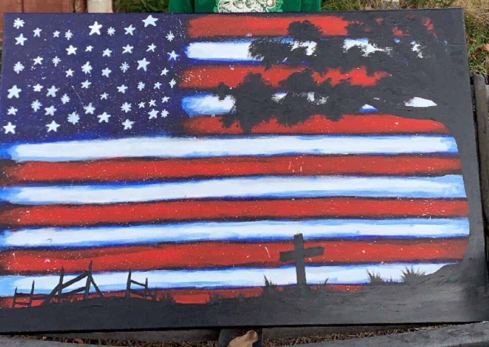 A bold tribute to country and faith, this American flag canvas is hand-painted and uniquely finished by me. Each piece carries its own character — from the movement in the brush strokes to the silhouette details of the cross, fence line, and trees. No two will ever look exactly the same.